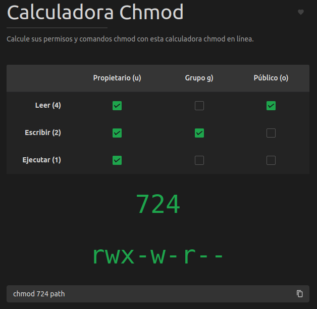 Utilizando la herramienta en linea IT-Tools, generaremos el comando completo para cambiar los permisos de un archivo o carpeta, utilizando el comando chmod.